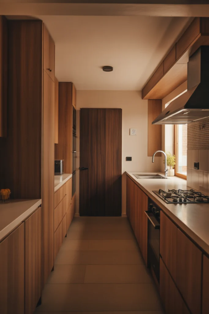 Warm wood tones create a welcoming, cozy atmosphere in narrow kitchen layouts. Natural materials like walnut, oak, and teak offer depth and richness without requiring large space. Wooden cabinets paired with neutral countertops provide a balanced look that blends modern and traditional aesthetics. Textured wood grains add visual interest and soften the linear structure of a galley kitchen.