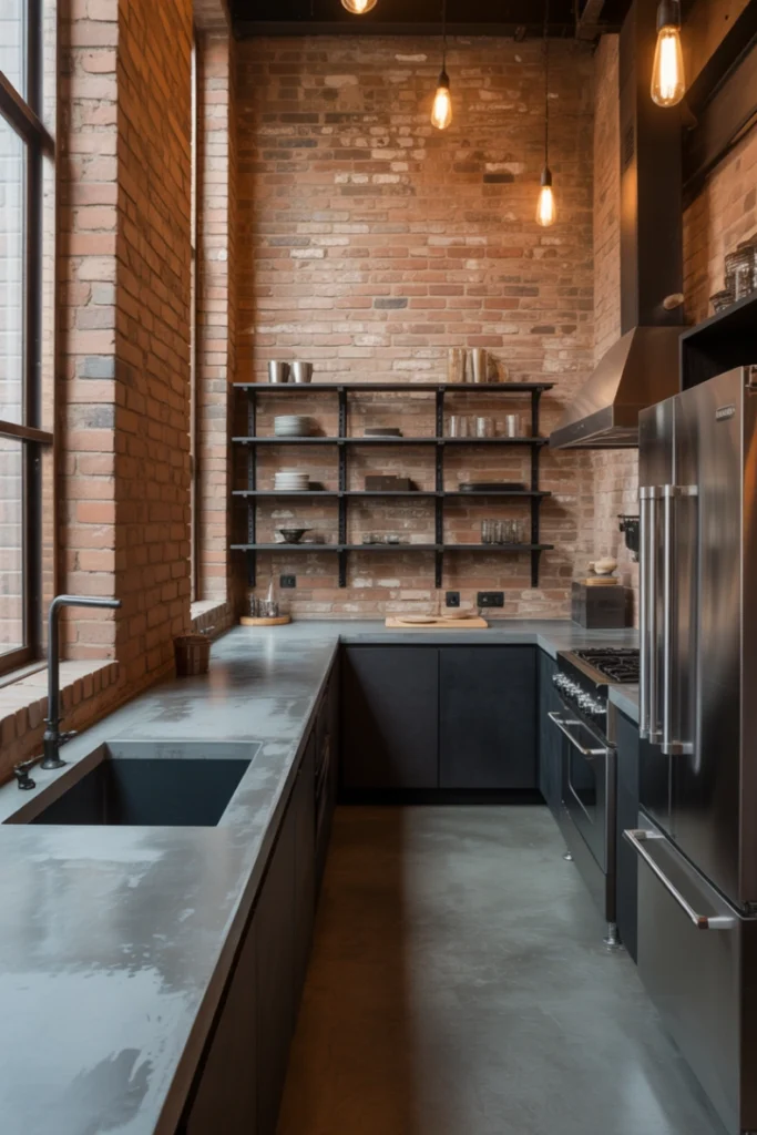 Beyond aesthetics, industrial materials are durable and require minimal maintenance. Stainless steel countertops resist heat and scratches, while metal shelving provides strong and efficient storage. Industrial lighting such as pendant bulbs or track lights enhances the functional character of the room. This design suits loft apartments or modern homes seeking bold personality.