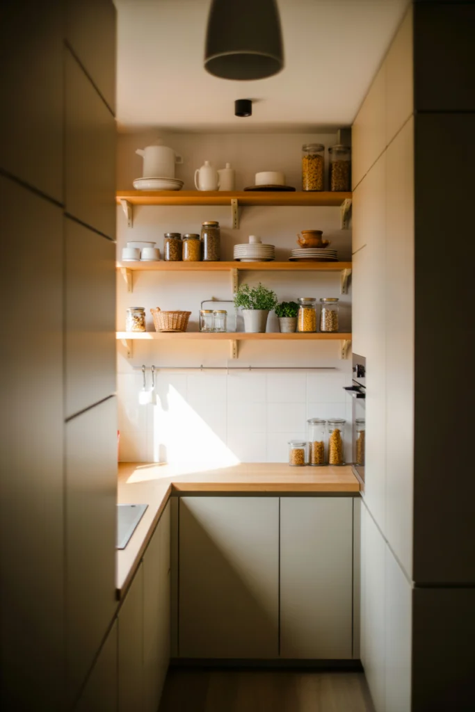 However, open shelving requires organization to prevent clutter. Consistent dishware colors or neatly stacked ingredients help maintain visual harmony. Lighting under shelves enhances functionality and highlights decorative items like plants or jars. Open shelving encourages intentional styling and creates a more breathable layout without altering the kitchen’s footprint.