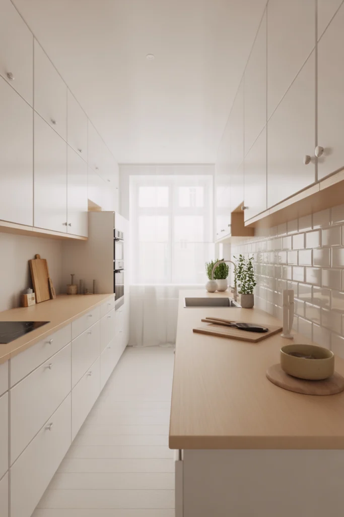 Scandinavian design is ideal for small galley kitchens due to its emphasis on light colors, simple forms, and efficient function. White, pale wood, and muted pastels create a fresh, airy feel that makes the space appear larger. Streamlined cabinets and integrated handles provide a clean and elegant look, avoiding unnecessary visual complexity.