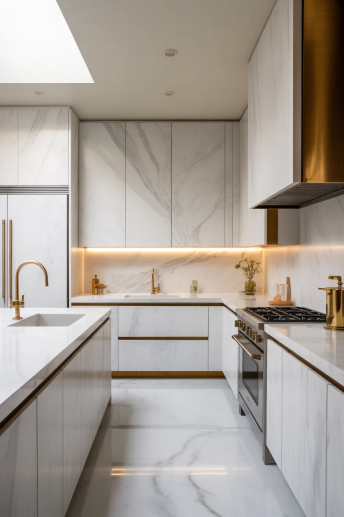 Luxury marble transforms a narrow kitchen into an elegant and timeless space. Marble countertops, waterfall edges, and full-height marble backsplashes elevate the design instantly. Light-colored marble improves brightness and gives the kitchen a high-end appearance. Paired with metallic accents such as brass or chrome, the kitchen exudes sophistication without feeling overwhelming.