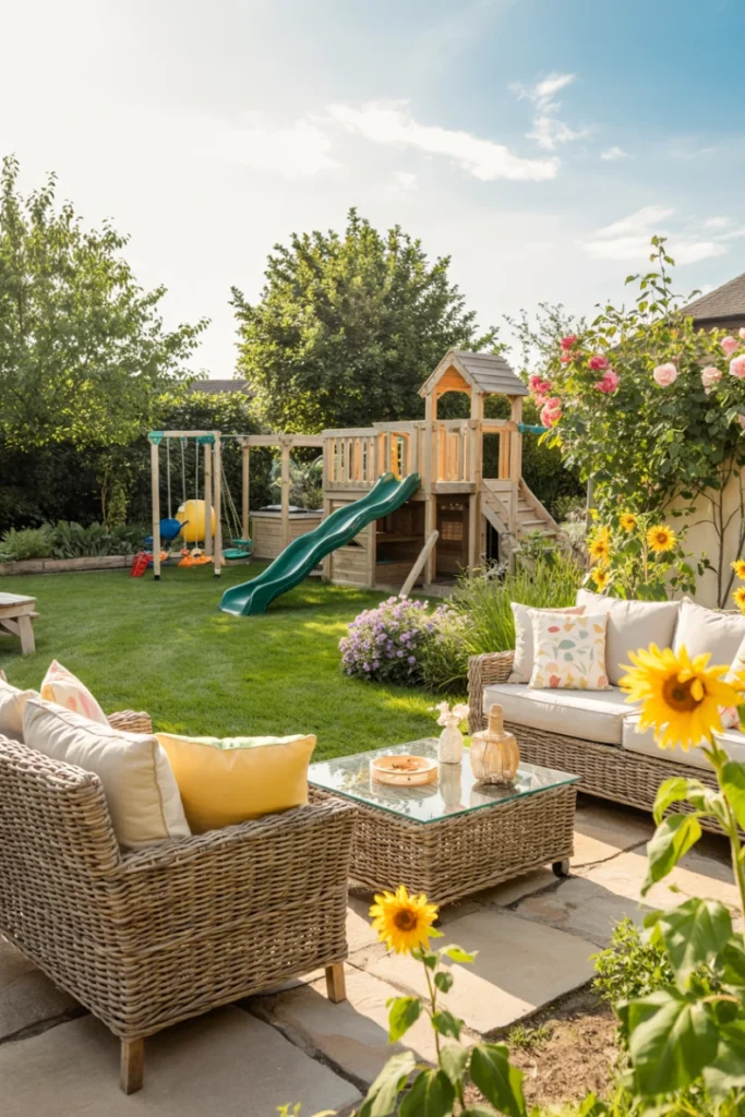 Durable materials, shaded areas, and seating for supervision enhance functionality. These garden design ideas ensure the space remains attractive while meeting the practical needs of family life.