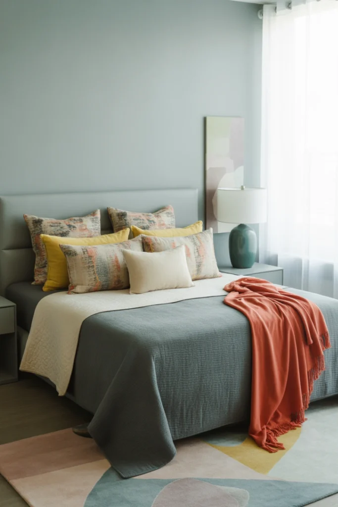 Pillows, rugs, art, and décor pieces are great ways to incorporate color without committing to a full redesign. This idea keeps your bedroom modern and fun while still feeling calm.