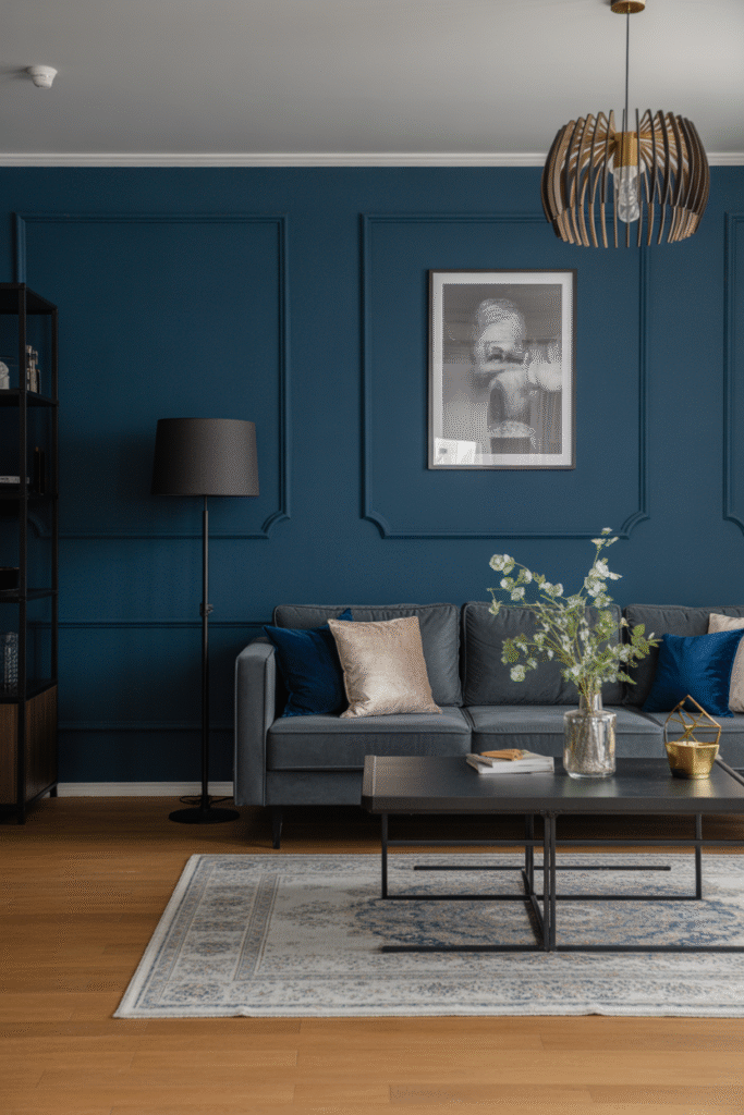 A navy blue feature wall is bold, sophisticated, and instantly eye-catching. When paired with gray furniture, the space feels grounded and modern without appearing too dark. The richness of navy adds drama, while gray pieces help balance the intensity. Use mid-tone or charcoal gray sofas to create contrast, and incorporate metallic elements like brass floor lamps or gold-framed artwork to bring warmth into the palette.