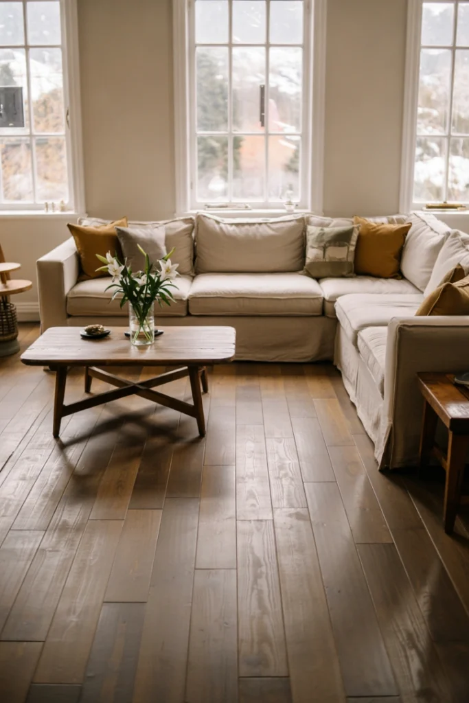 Light gray flooring is ideal for creating bright and open interiors. It reflects natural light better than darker tones while offering more depth than white floors. This makes it especially effective in smaller rooms or homes with limited sunlight.