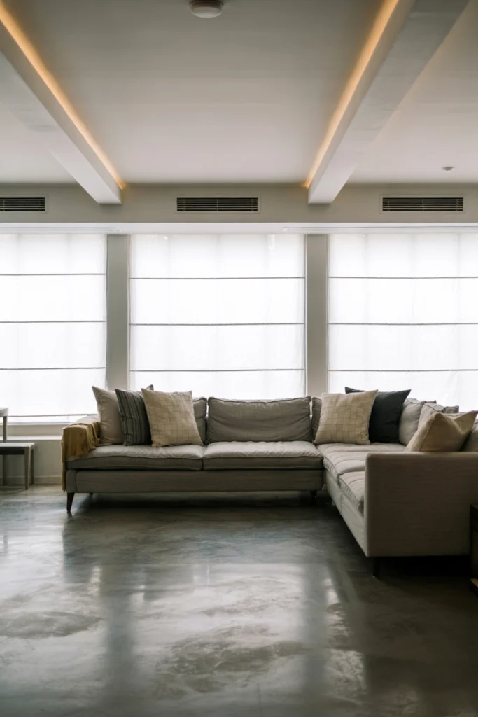 Soft furnishings and warm lighting prevent concrete floors from feeling cold. Among Gray Floor Ideas, concrete floors add bold character and urban appeal.