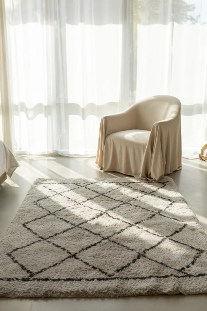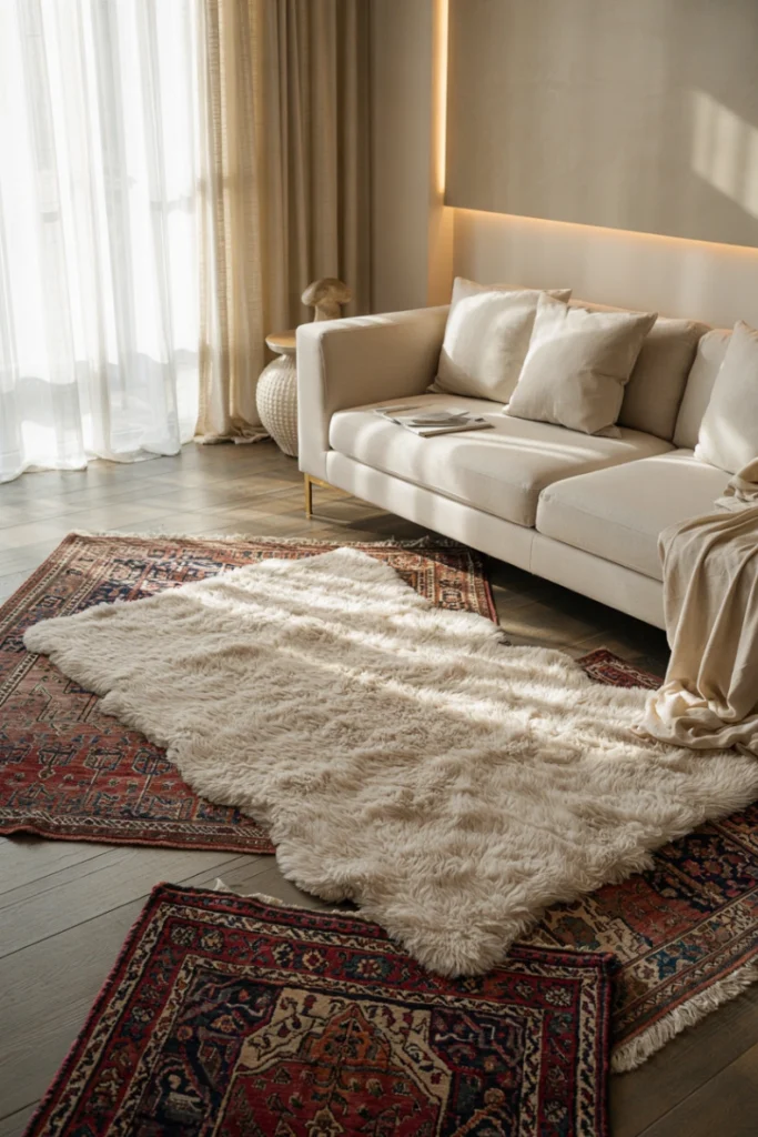 Layered rugs soften gray floors and add texture. Rugs introduce warmth and define zones within open layouts.