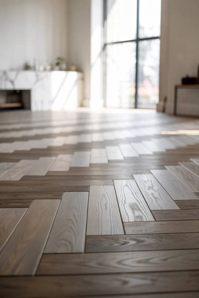 Herringbone patterns add movement and sophistication to gray floors. This layout enhances visual interest while maintaining a neutral color palette.