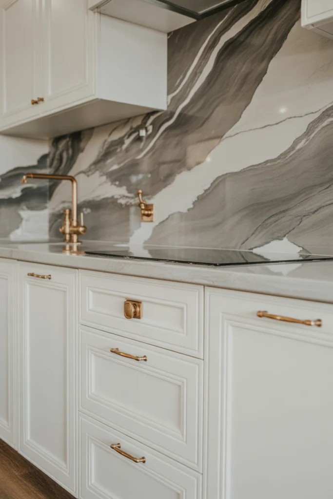 A gray marble backsplash adds luxury and elegance to the kitchen. The natural veining patterns bring texture, movement, and visual interest, making the backsplash a standout feature. Whether you choose polished marble for shine or honed marble for a matte appearance, the effect is undeniably sophisticated. Gray marble works beautifully with white, black, or gray cabinetry and adds depth without overwhelming the space.