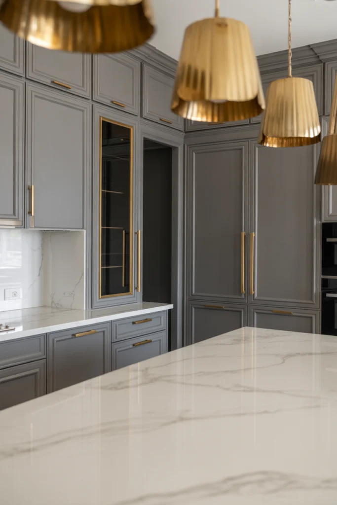 Gold accents add a luxurious and elegant touch to a gray kitchen. The warm tones of gold pair beautifully with cool gray shades, creating a balanced and sophisticated contrast. Whether used in hardware, faucets, pendant lights, or décor pieces, gold brings a sense of richness and glamour. Soft gold or brushed brass finishes offer a more understated look, while polished gold makes a bolder statement.