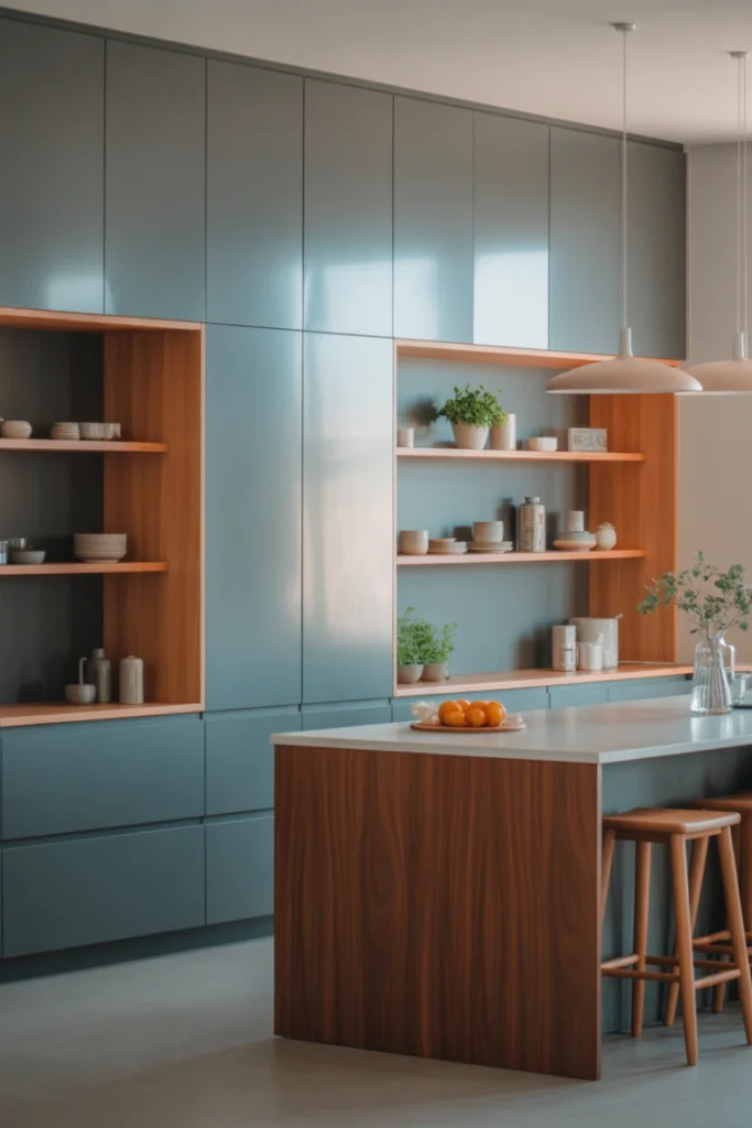 This setup works particularly well for smaller kitchens, as open shelving helps create an airy feel. The gray finish blends smoothly with a range of wall colors, backsplash designs, and cabinet styles. You can display cookbooks, dishware, planters, or glassware to personalize the space. Open shelving is both practical and aesthetically pleasing, adding a touch of casual charm to the kitchen.