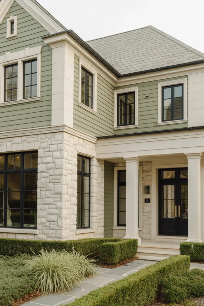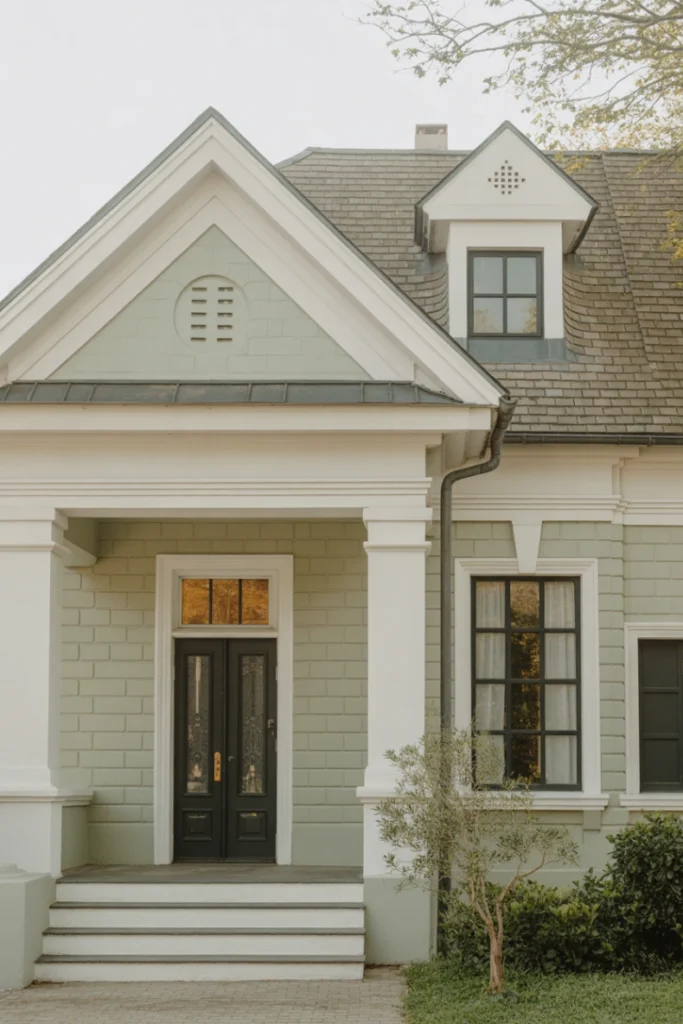 White window frames, door casings, and fascia boards bring clarity and brightness to the overall look, making the home feel open and welcoming. This green house exterior idea is particularly well suited for cottages, suburban homes, and transitional architectural styles. The combination delivers sophistication while remaining approachable, making it a popular choice for homeowners seeking understated charm.