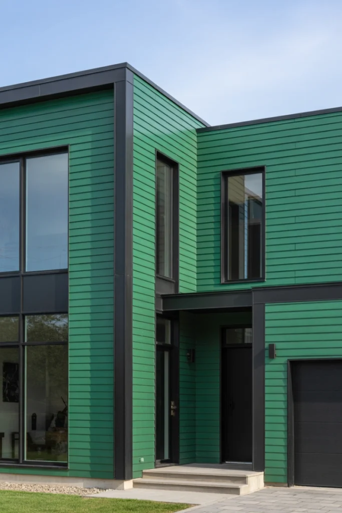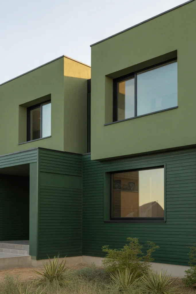 A modern green exterior combined with black accents creates a bold and contemporary aesthetic. Deep green shades paired with black window frames, doors, and metal details result in a striking contrast that emphasizes clean lines and modern architecture.