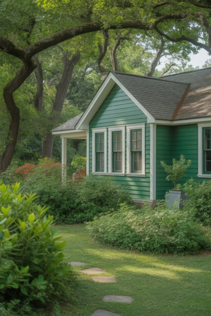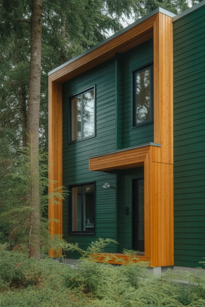 Wooden doors, beams, shutters, or pergolas soften the intensity of dark green while adding character and warmth. This green house exterior idea works exceptionally well for modern cabins, contemporary homes, and properties surrounded by trees or landscaped gardens. The contrast between dark green and wood creates a refined yet inviting atmosphere that feels intentional and timeless.