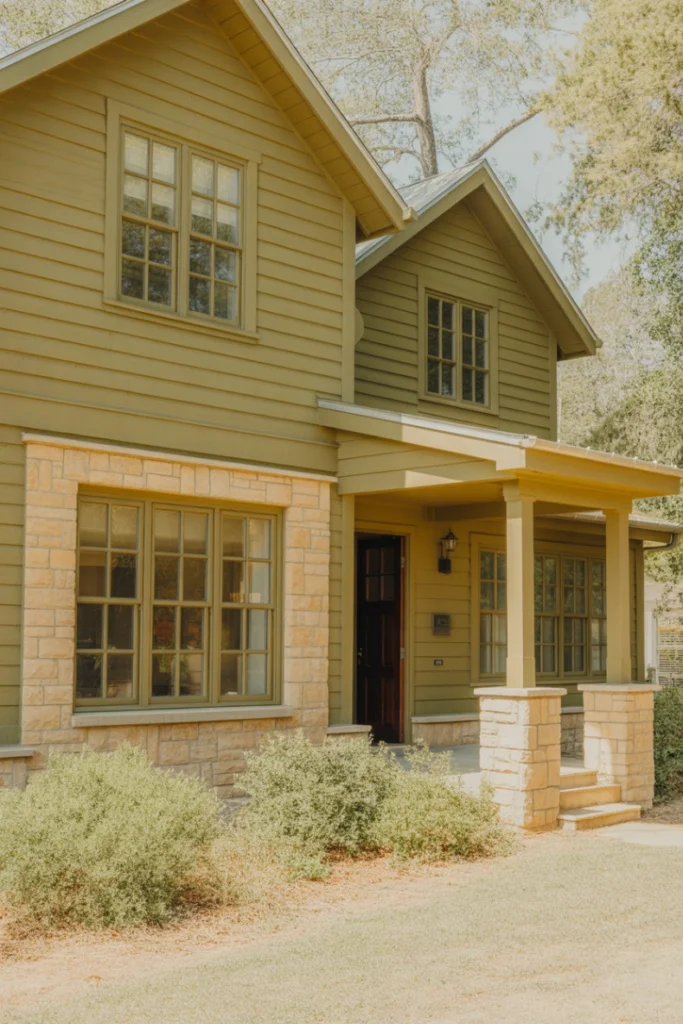 This green house exterior idea pairs beautifully with bronze, black, or oil-rubbed hardware and neutral trim colors. Olive green exteriors are particularly well suited for Mediterranean, ranch-style, and contemporary homes. The color creates a welcoming presence that feels grounded, natural, and effortlessly stylish.