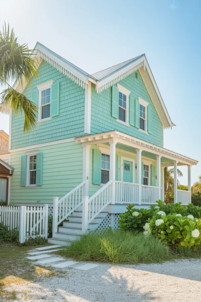 Mint green exteriors offer a fresh, breezy aesthetic inspired by coastal living. This light, cheerful shade reflects sunlight beautifully and creates an airy, relaxed atmosphere. Mint green is especially effective in warm climates where lighter colors help homes feel cooler and more open.