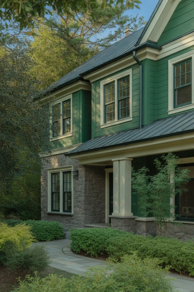 Forest green exteriors offer a bold, elegant appearance that feels deeply connected to the natural environment. This rich shade creates a dramatic backdrop that enhances architectural features and landscaping alike. When paired with stone elements, forest green homes gain texture, contrast, and a sense of permanence.