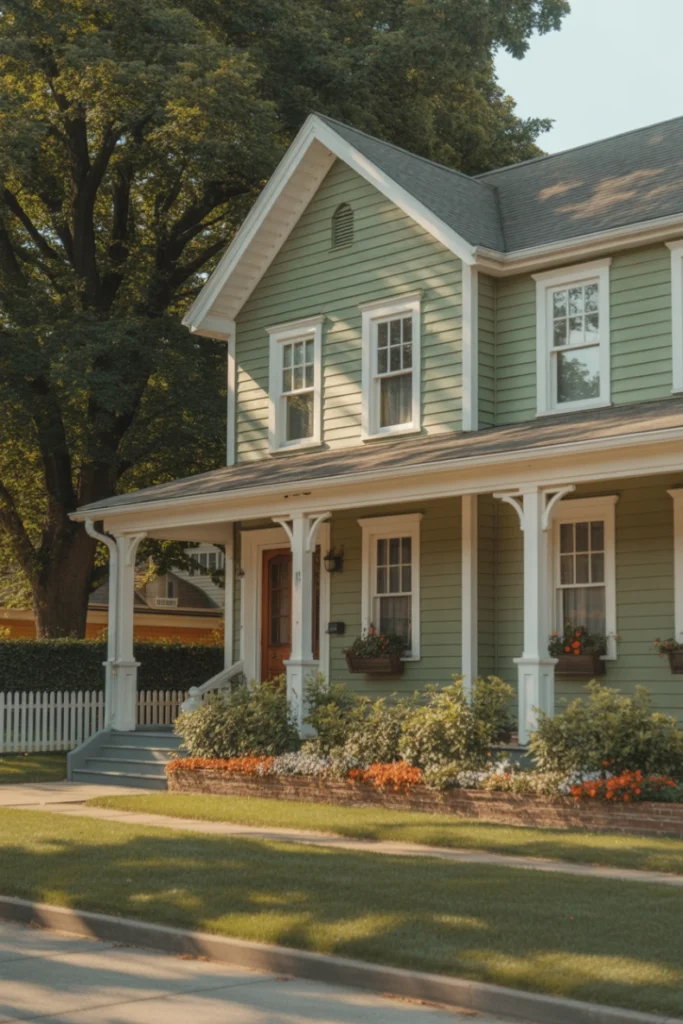 This green house exterior idea pairs beautifully with cream, beige, or soft gray trim. It works especially well for vintage homes, cottages, and suburban neighborhoods where subtle individuality is desired. Pastel green exteriors create a sense of comfort and nostalgia while remaining fresh and visually appealing.