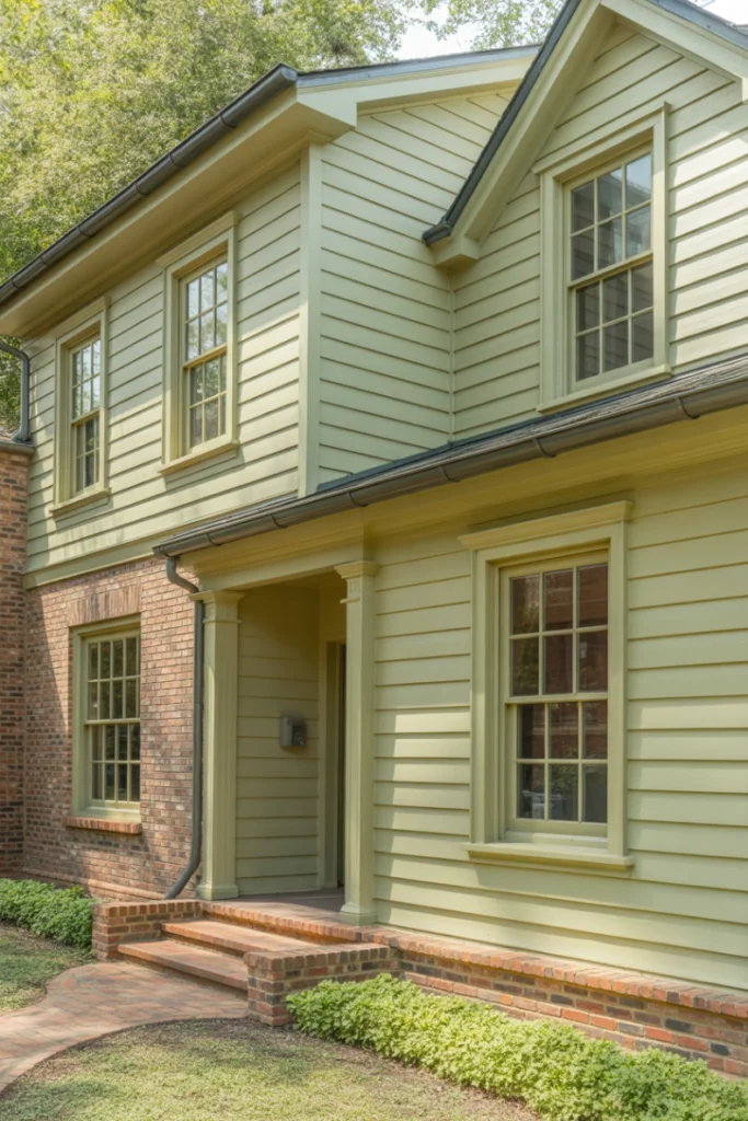 Light green exteriors paired with brick details offer a perfect balance between freshness and tradition. The soft green color brightens the home, while brick elements add texture and classic appeal. This combination works well across a variety of architectural styles, from traditional to transitional designs.