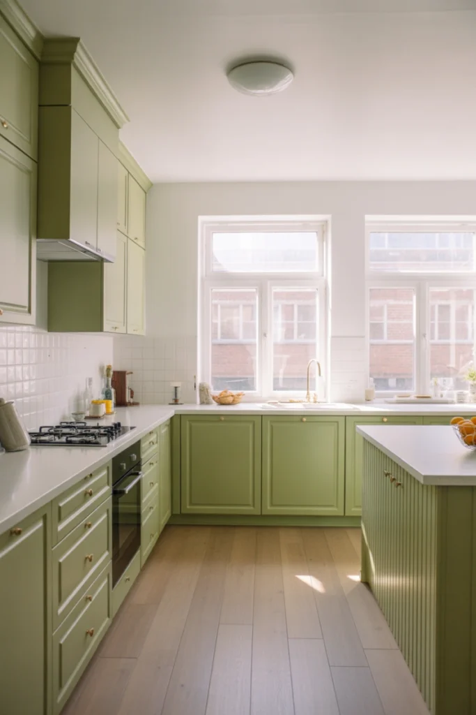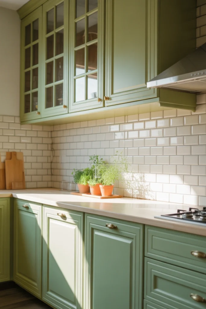 This style works well in Scandinavian, farmhouse, and modern kitchens. Light or medium wood tones complement most shades of green, creating a cohesive look that feels both stylish and welcoming.