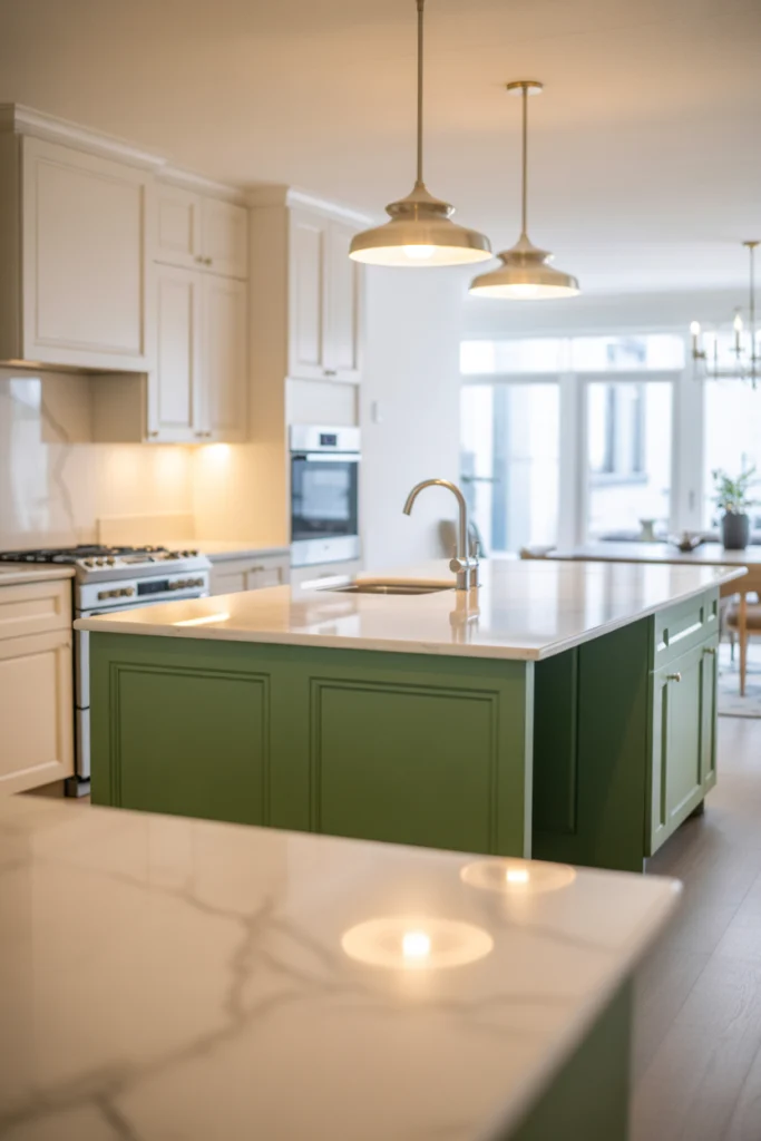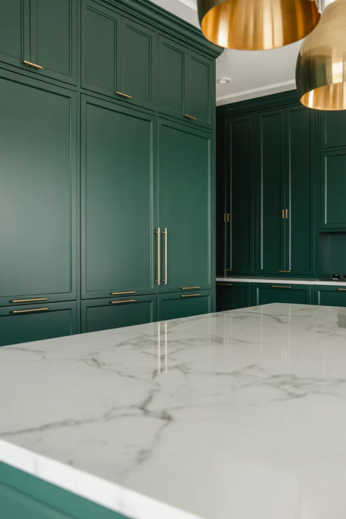 This pairing works across various green shades, from soft sage to deep emerald. Proper lighting enhances the marble’s texture, ensuring the kitchen feels bright and sophisticated.