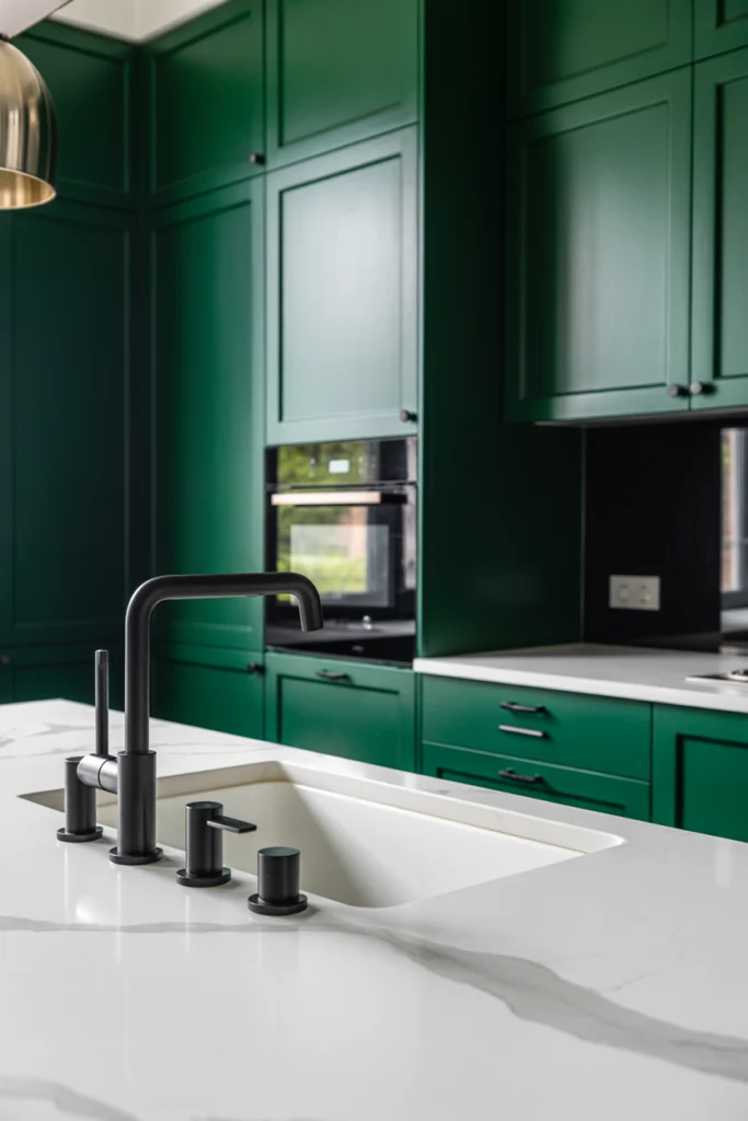 Adding black accents to a green kitchen creates a bold, modern contrast. Black hardware, fixtures, or light fittings ground the green tones and add visual interest.