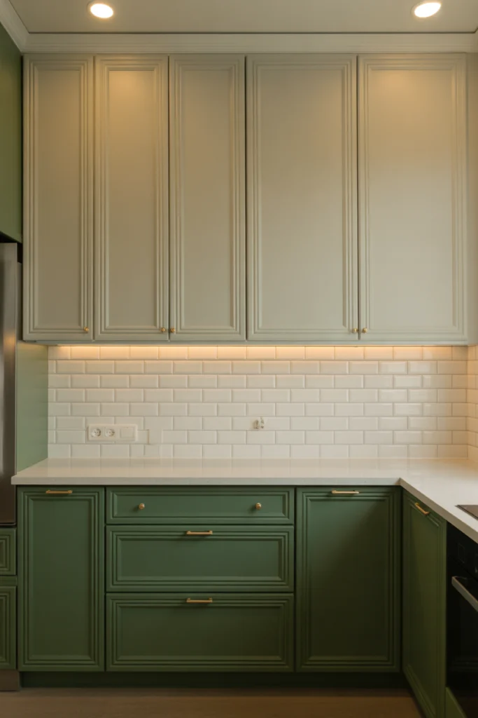 Two-tone green kitchens use different shades of green to create depth and dimension. Lighter greens on upper cabinets paired with darker greens below offer visual balance and sophistication.