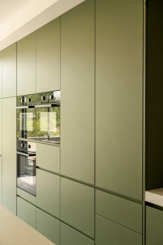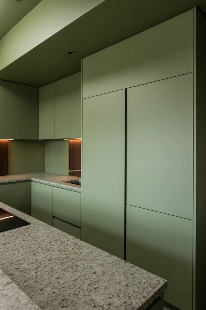 Matte green cabinets offer a contemporary twist on traditional green kitchens. The matte finish softens the color, reducing glare and creating a sophisticated, modern look. This style works particularly well with handle-less cabinetry and minimalist layouts.