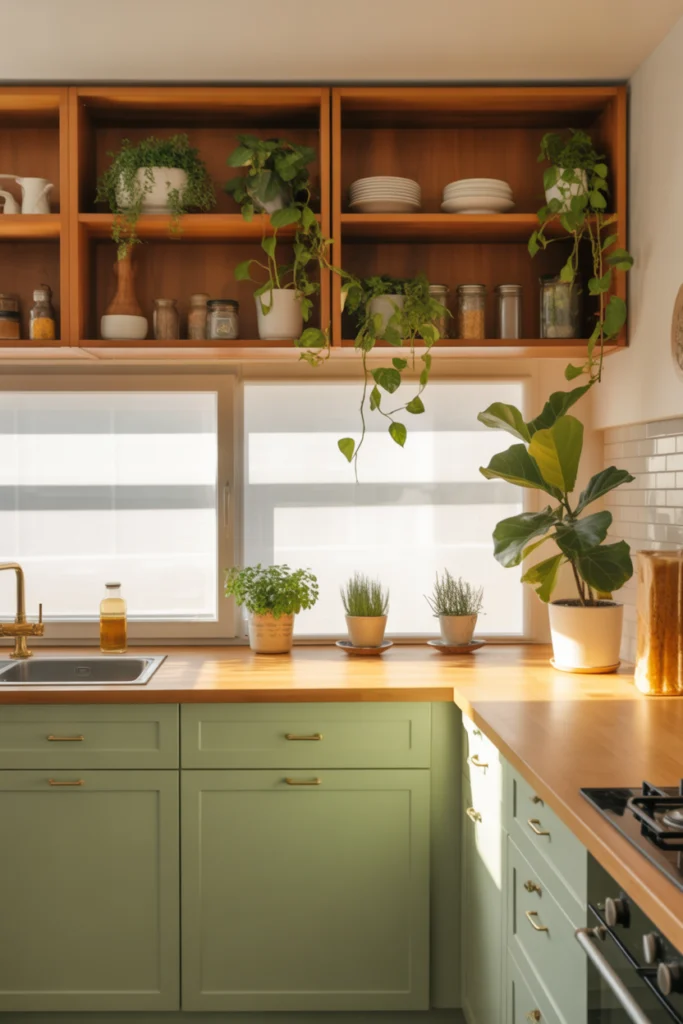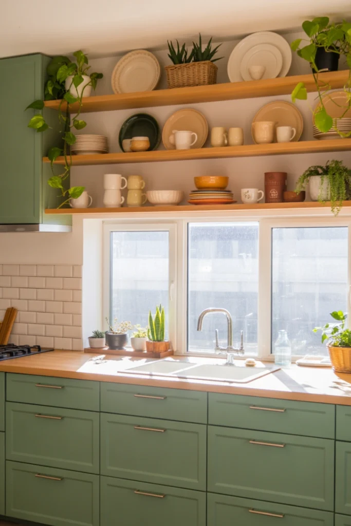Open shelving paired with green cabinets adds personality and practicality. It allows homeowners to display dishware, plants, and décor while keeping the space open.