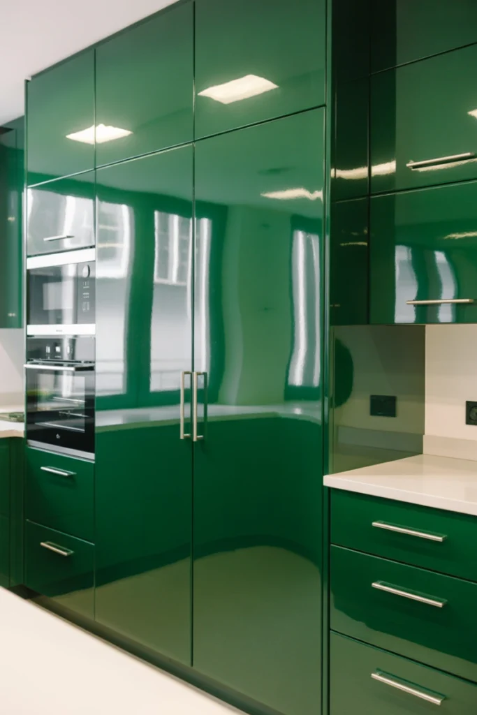 Glossy green cabinets reflect light, making kitchens feel brighter and more spacious. This finish works particularly well in contemporary and modern designs.