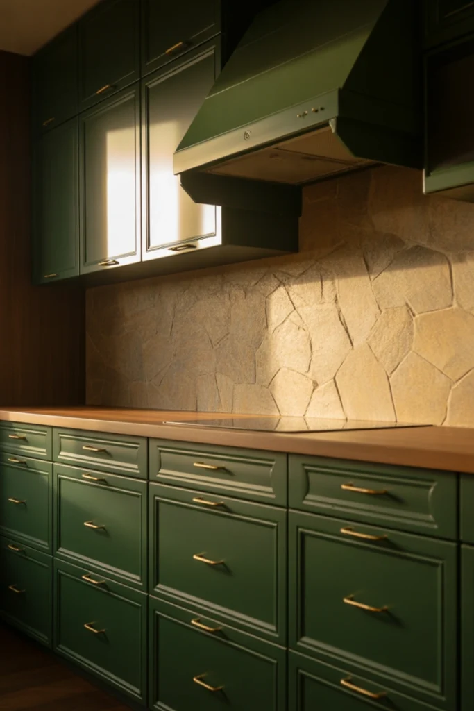 A stone backsplash adds texture and natural beauty to green kitchens. The combination enhances the organic feel of the space while maintaining elegance.
