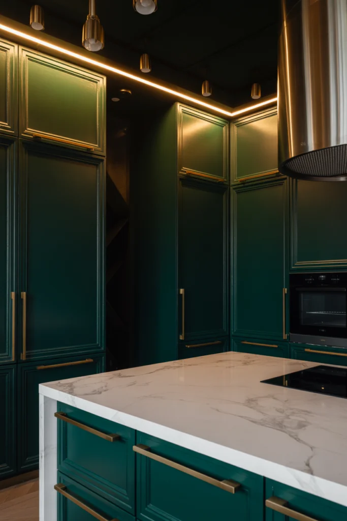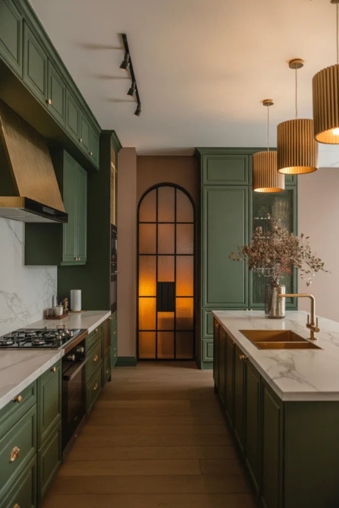 The richness of dark green adds depth, while gold accents introduce warmth and refinement. Marble countertops, glass pendant lights, and subtle lighting enhance the luxurious atmosphere. This style is perfect for homeowners who want a bold statement kitchen that feels upscale, elegant, and timeless.