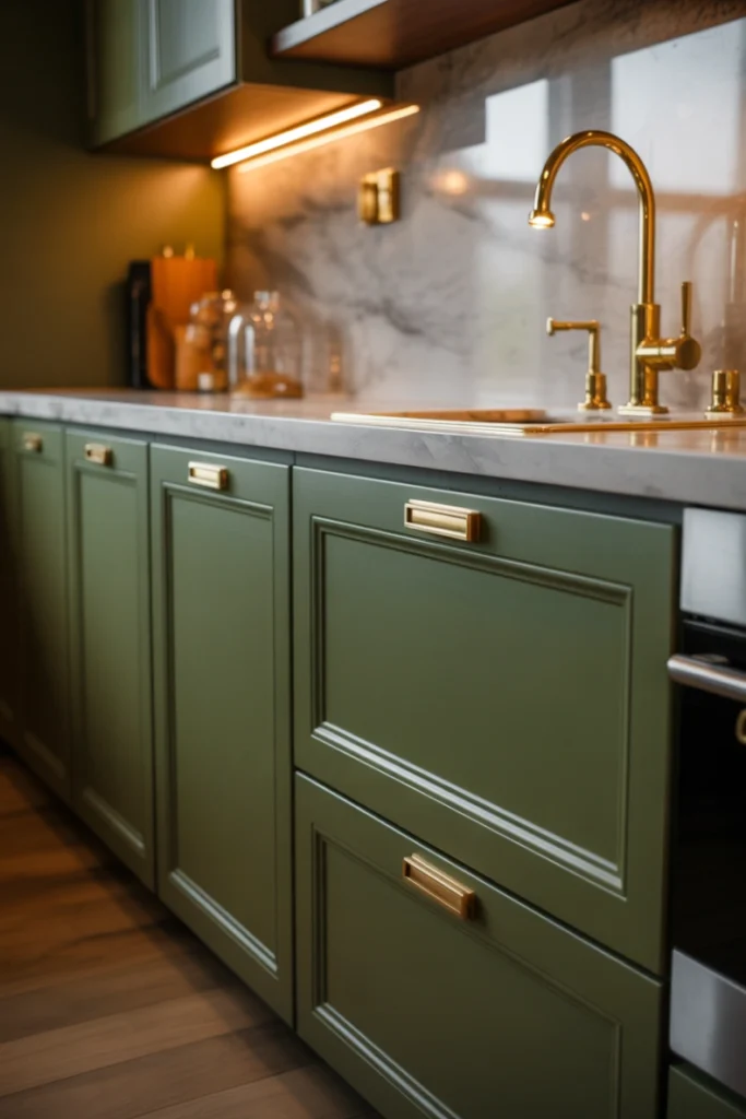 Brass fixtures add warmth and elegance to green kitchens. This combination enhances both modern and classic designs, creating a rich visual contrast.