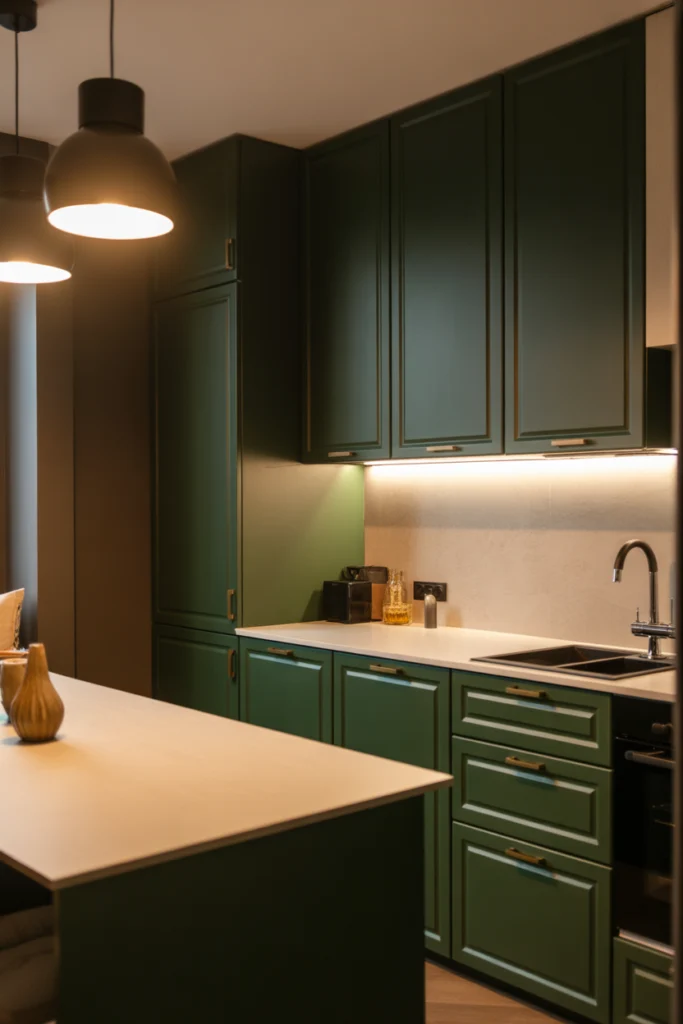 Dark green can work beautifully in small kitchens when paired with proper lighting and reflective surfaces. It adds depth and character without overwhelming the space.
