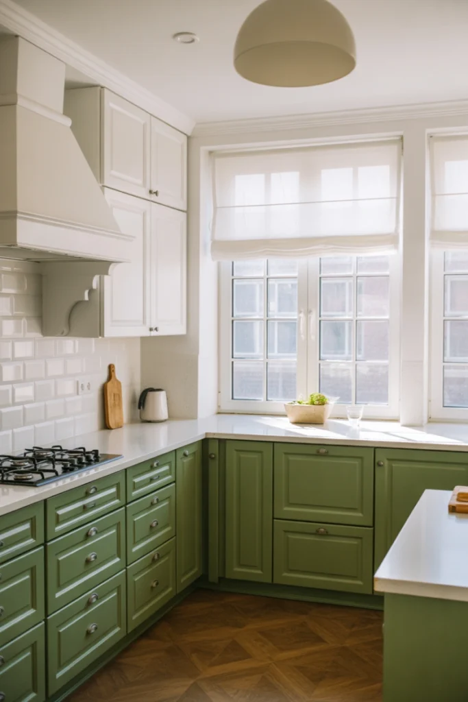 The contrast between green and white allows for creative flexibility in hardware, backsplash, and flooring choices. Whether you choose sage, emerald, or olive green, pairing it with white ensures a balanced and harmonious kitchen design.
