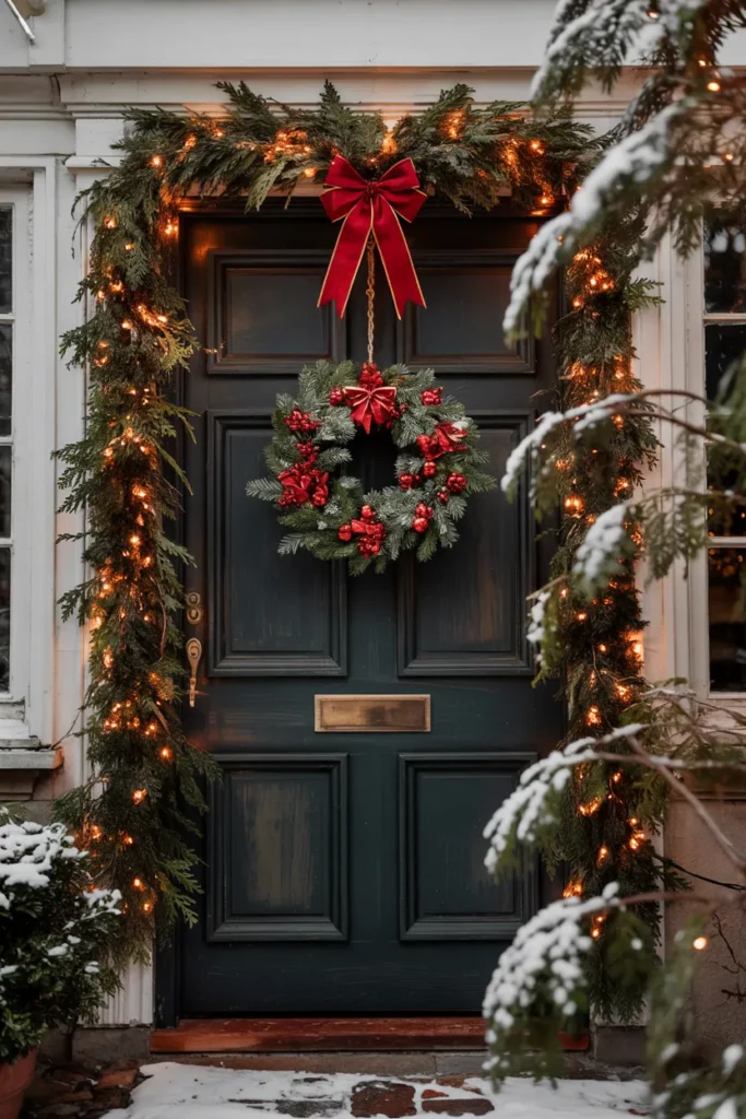 You can also add a red bow or wreath to complete the look. This design draws attention to your home’s entrance, creating a warm, inviting holiday vibe.