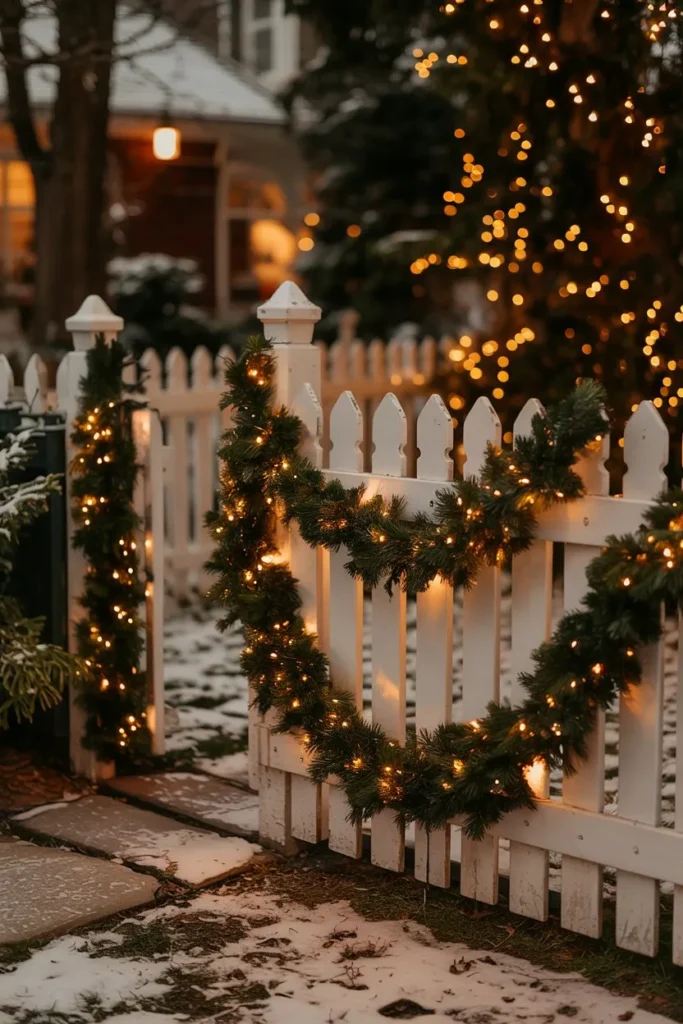 If you have a front fence, weave green garlands through it and wrap them in red lights. The greenery pairs naturally with the fencing, giving your exterior depth and festive detail.