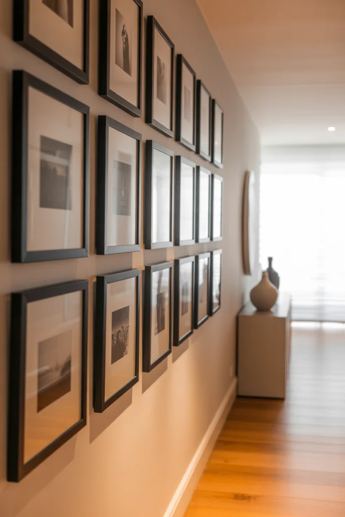 Turn your hallway into an art showcase with a gallery wall. Mix framed prints, family photos, and small art pieces to create a personalized display. Use consistent frame styles or a cohesive color palette for a unified look.
