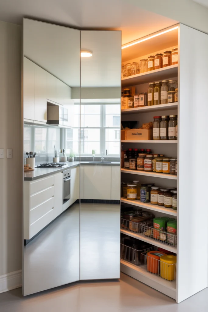 Inside, add shelves, baskets, and drawers to make the pantry highly functional. When closed, the mirror door blends into the kitchen decor and reflects light for a more open feel. This design brings a luxurious, modern touch without taking up additional space, making it both practical and beautiful.