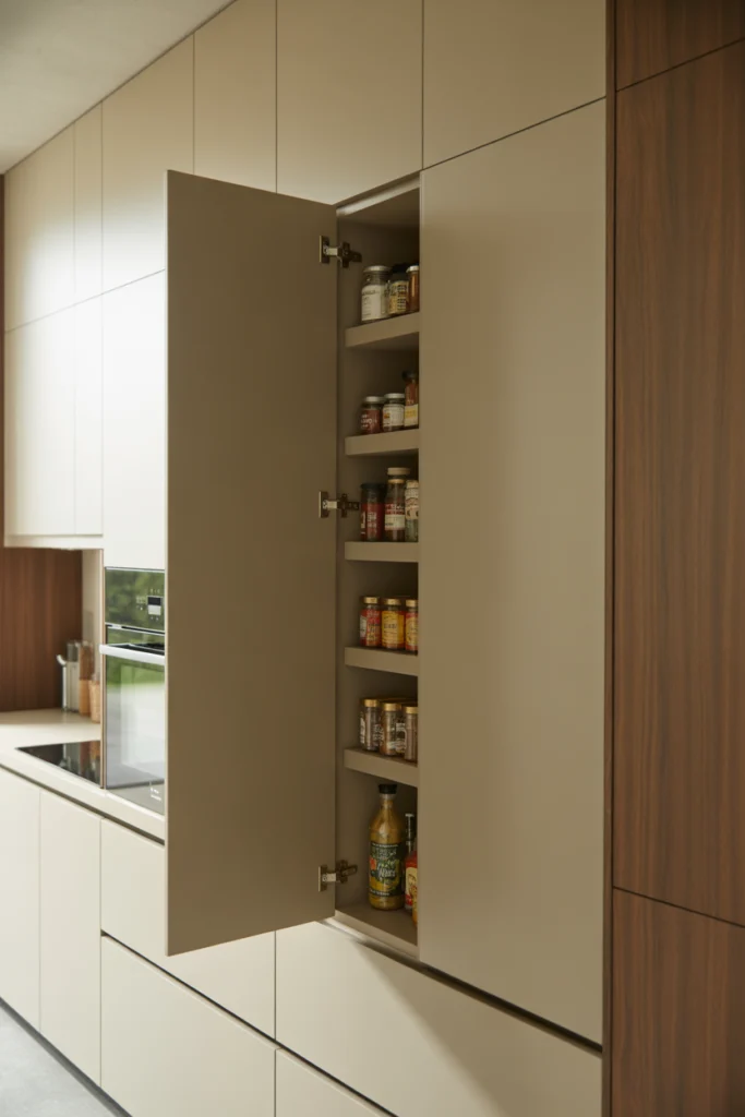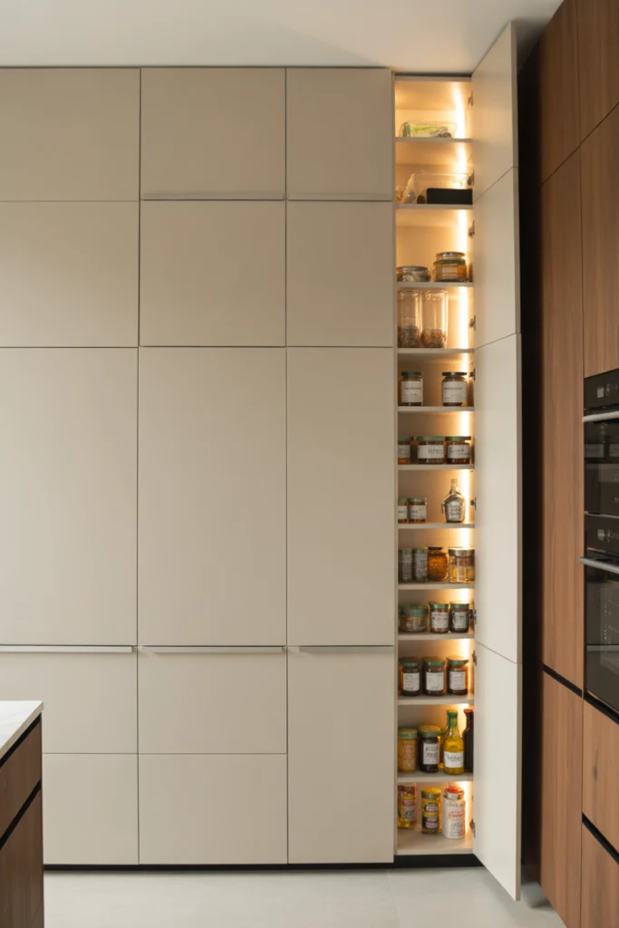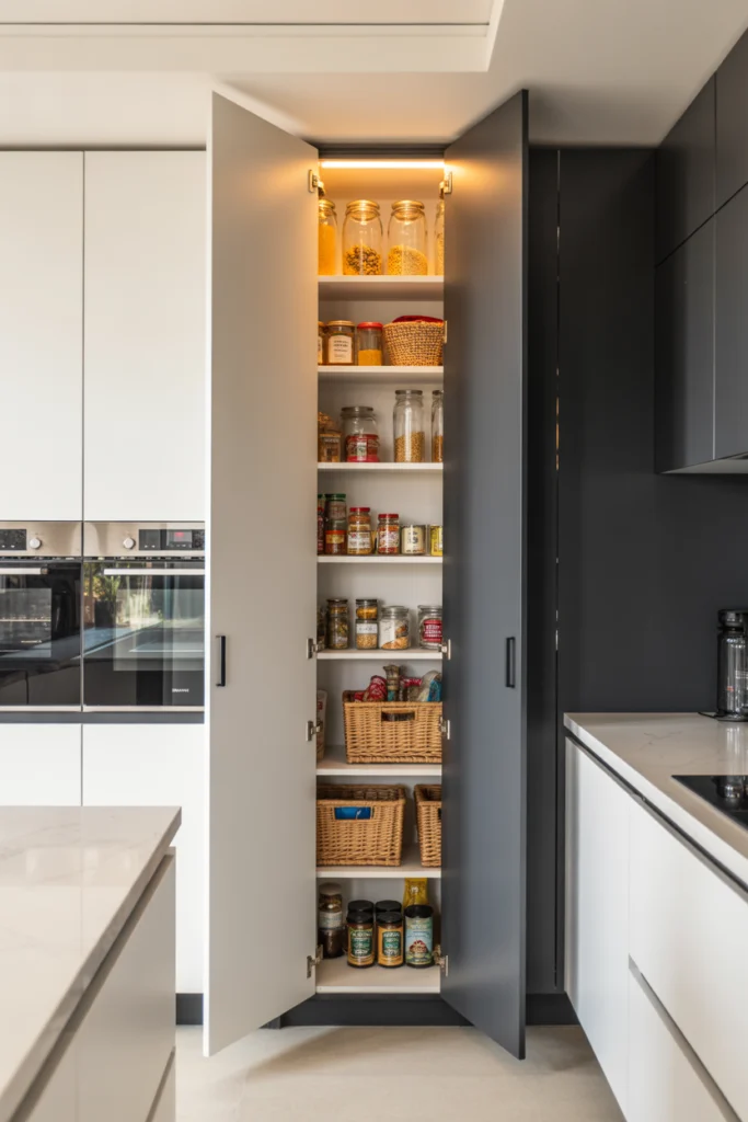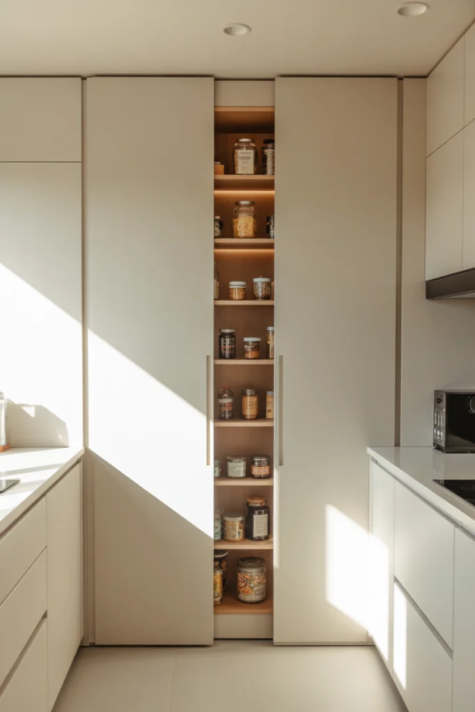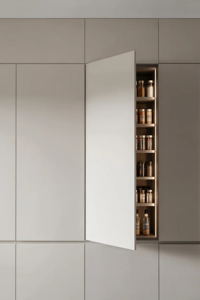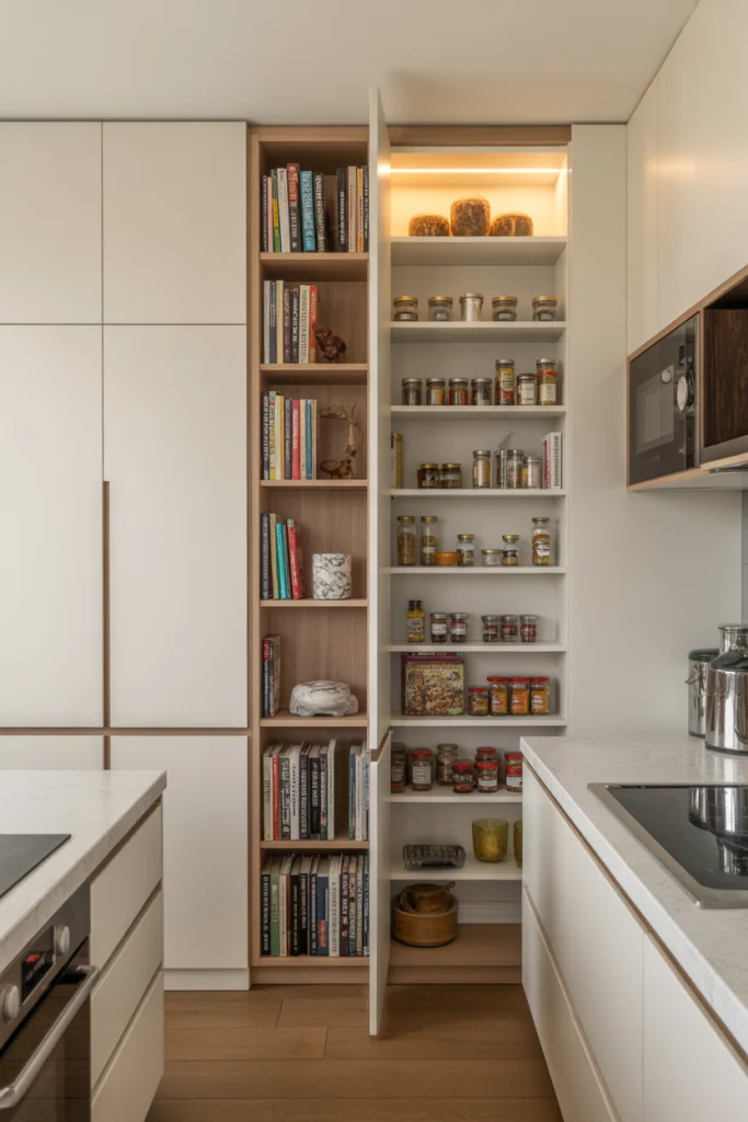 Inside the false wall pantry, you can store spices, jars, snacks, and kitchen accessories. The shallow design ensures nothing gets lost at the back. This idea works particularly well in ultra-modern, minimalist kitchens that favor clean lines and invisible storage.