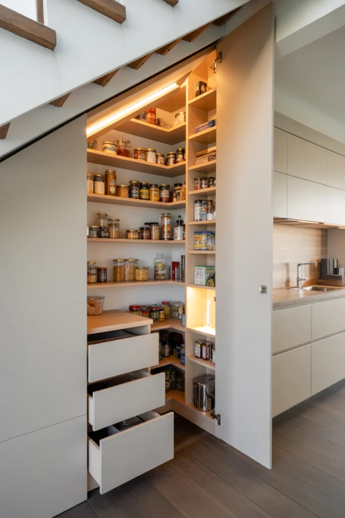 Inside, the angled walls can be used for custom shelving, baskets, and pull-out drawers. This setup gives you more storage space and keeps clutter away from the kitchen counters. It’s a practical way to transform unused space into a valuable hidden pantry for modern or small homes.