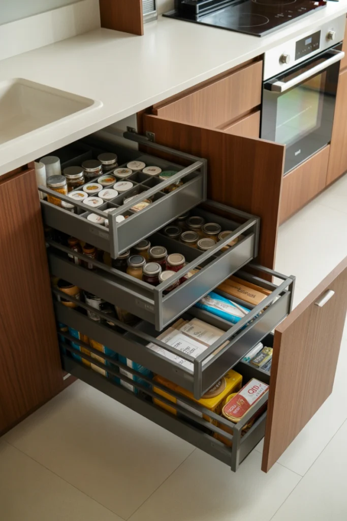 Inside the deep drawers, you can organize snacks, canned goods, and baking supplies with dividers. This hidden pantry style keeps everything tidy and prevents items from getting lost. It’s an efficient way to create pantry storage without needing extra floor space or adding a separate pantry room.