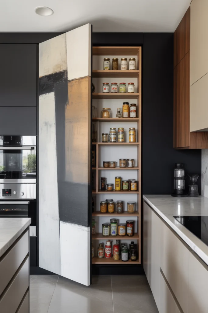 This creative idea hides your pantry behind a door disguised as a large wall art piece. The artwork becomes the focal point of your kitchen, while the pantry behind it stays completely concealed. You can choose art that matches your kitchen style or something bold for contrast.