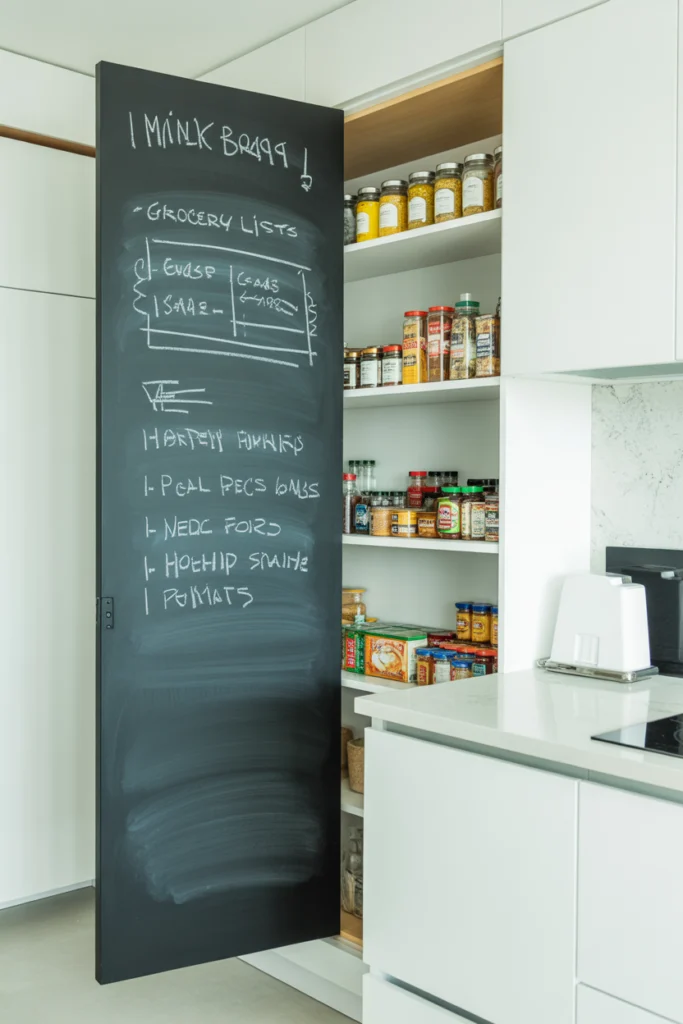 A chalkboard door pantry adds creativity and function to your kitchen. From the outside, it looks like a simple chalkboard where you can write grocery lists, meal plans, or reminders. But behind the door is a full pantry filled with shelves and storage compartments. This idea combines style, playfulness, and practicality.