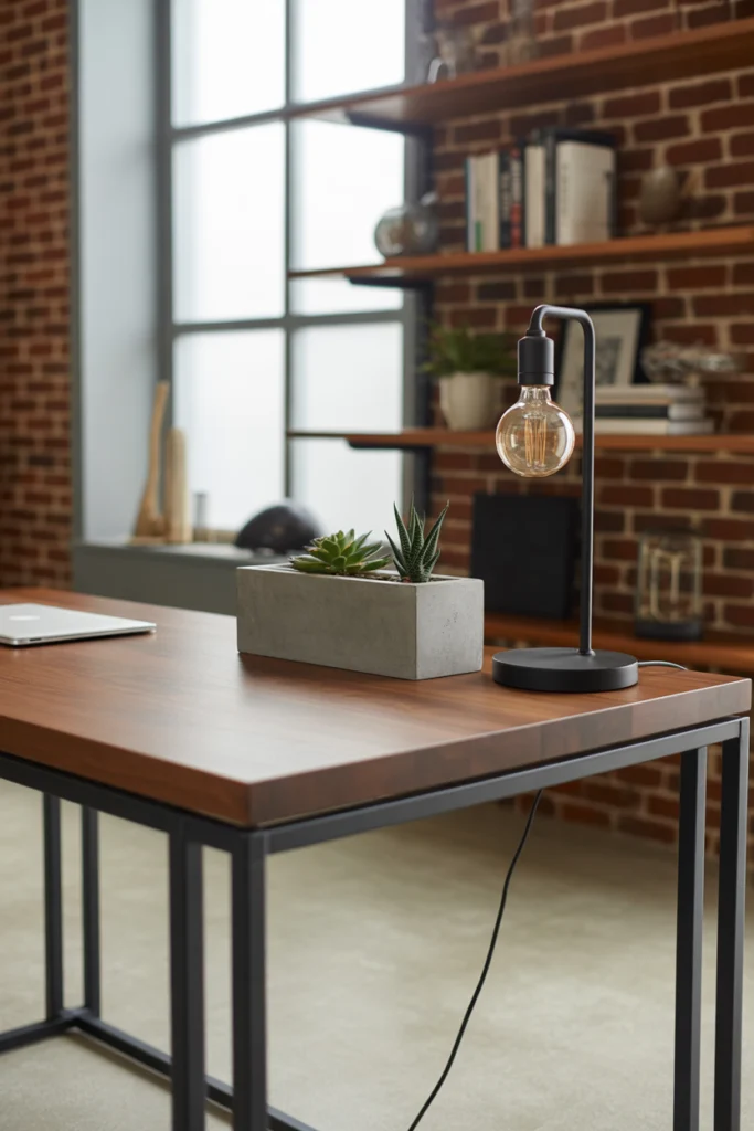 Industrial-style desks combine rugged materials with modern design. These Home Office Desk Ideas often feature metal frames and wood surfaces, creating a bold yet functional aesthetic.