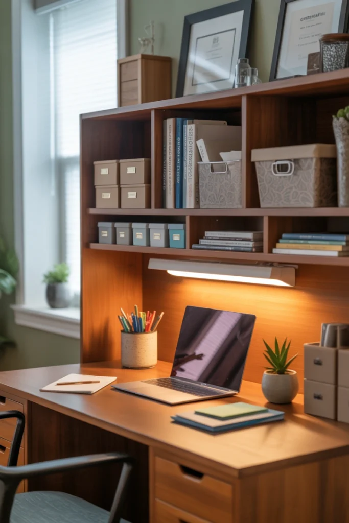 Desks with hutches maximize vertical storage. These Home Office Desk Ideas include overhead shelves or cabinets that increase storage capacity without expanding the desk’s footprint.