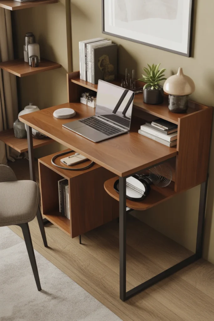 Functionally, hidden storage helps maintain a tidy workspace, especially in small rooms. It allows the desk to serve both work and decorative purposes. This approach is ideal for minimalist interiors.