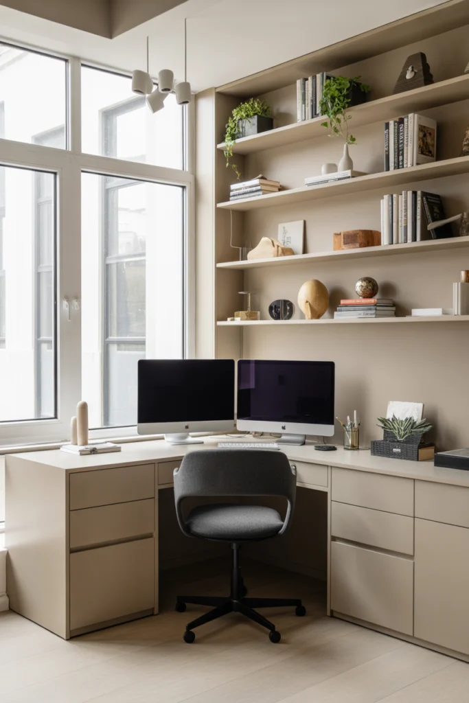 Corner desks make excellent use of underutilized space. These Home Office Desk Ideas fit neatly into corners, allowing you to transform awkward areas into productive work zones. By wrapping around the corner, they provide ample surface area without dominating the room.