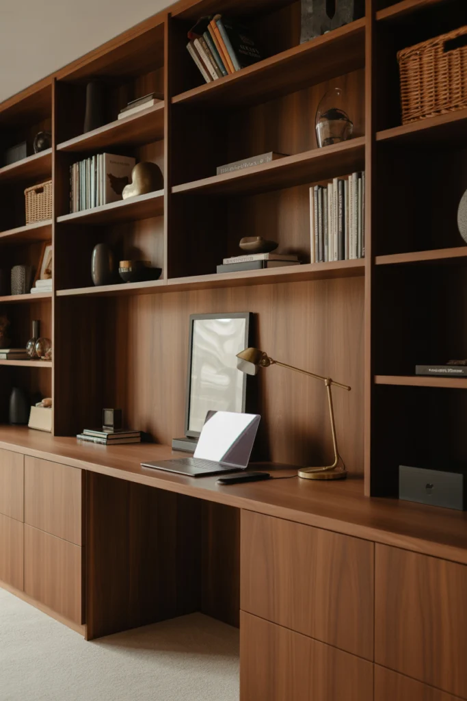 Beyond aesthetics, built-in desks improve workflow by keeping essentials within reach. They work especially well in dedicated offices or converted rooms where a permanent setup is desired. This approach combines style, functionality, and long-term usability.
