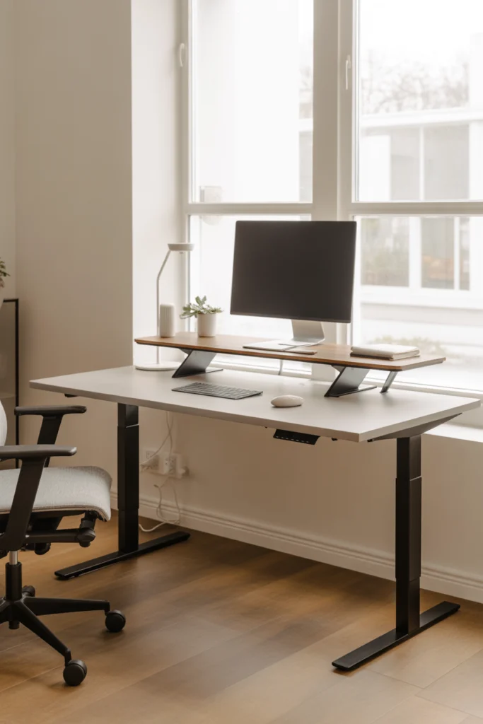 Adjustable height desks support ergonomic working habits. These Home Office Desk Ideas allow users to alternate between sitting and standing, improving comfort and posture throughout the day. They are increasingly popular in modern home offices.